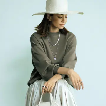 端境期(はざかいき)につい頼ってしまうベーシックな黒ニットには、構築的なフォルムの地金アクセサリーを重ねて、クールなメリハリを加算したい。新しい「艶」のレイヤードで、毎日の装いが鮮度高く見違える!