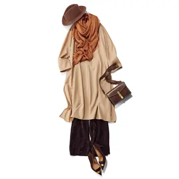コート¥71,500・パンツ¥41,800/サードマガジン ニット¥12,100/ゲストリスト(ステートオブマインド) ネックレス¥45,100(ローラ ロンバルディ)・バッグ¥121,000(ザンケッティ)/以上room3138 ストール¥44,000/アイネックス(アソース メレ) 靴¥88,000/ジミー チュウ