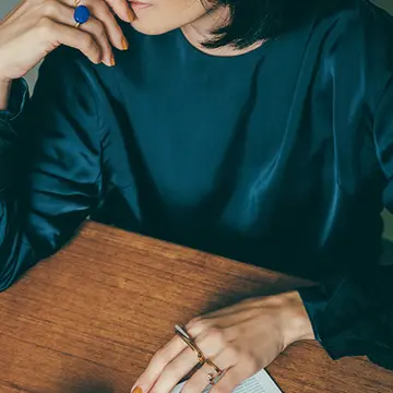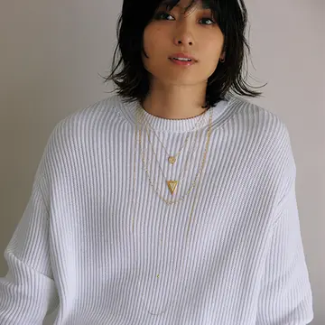 ぼやけてしまいがちなニュアンスカラーのニットを上級者っぽく着こなすには、今どきのアクセサリーを盛ってみるのが正解。リングはカラーストーンをモダンに仕上げたデザイン、コード使いに注目を。
