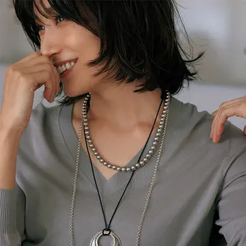 タイガーアイ、オリーブクォーツ、ブラックオニキス、マラカイト……モダンで辛口、人とかぶらない色石たちがニュアンスカラーのツインニットに今どきの個性と高揚感をもたらす。