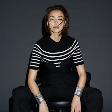 ネックレス「パッショノワール」〈1番上〉(WG×黒蝶真珠)¥1,210,000・〈2本目以降上から〉(すべてSV×黒蝶真珠)¥660,000・¥275,000・¥473,000・イヤカフ(SV)¥27,500/ミキモト カスタマーズ・サービスセンター(ミキモト) ボーダートップス¥15,400/ドローイング ナンバーズ 新宿店(ドローイング ナンバーズ) ジャケット¥123,200・パンツ¥88,000/エスケーパーズオンライン(ポステレガント)