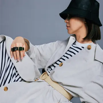 黒蝶真珠とブラックロジウム加工シルバーが織りなす世界観が魅力のユニセックスなコレクションに、シンプルなボーダーを組み合わせて。強い個性のあるものを優しく受け止めるのもボーダーの力。
