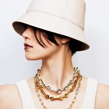 LAを拠点とするジュエリーブランド、ソフィー ブハイ。そのシルバージュエリーはすべて熟練職人によるハンドメイド。装飾を削ぎ落としたコンテンポラリーなデザインが、年齢・スタイルを問わず人気を呼んでいる。今回は、鎖骨の上にかかるよう計算された長さのカラーネックレス(Collar=首輪)を2種類重ねて。海のように深いブルーのラピスラズリは、石のパワーを感じさせる絶妙なボリューム。ゴールドヴェルメイユのトグルフック(とめ具)とのコントラストも美しい。重ねたシルバーボールのネックレスは、ボールをつなぐ黒のシルクノットが実にモダン。