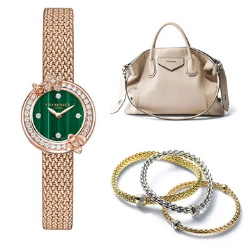 時計「ロレアート」(34㎜径、SS×D、クォーツ)¥1,386,000/ソーウインド ジャパン(ジラール・ペルゴ) ブレスレット[すべてMサイズ](左)「パノラマ」(WG×RG×D)¥884,400・(中)「プリマ」(RG×WG×D)¥389,400・(右)「プリマ」(YG×WG×RG)¥324,500/スイスプライムブランズ(フォッペ)