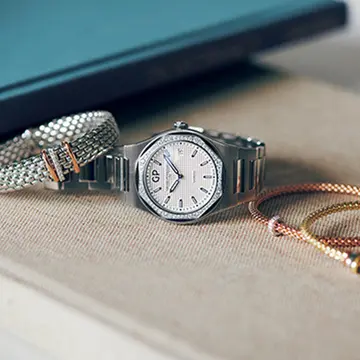 文字盤が自らにだけ見えるよう配されたケースと、クラスプのバランスが美しい「カデナウォッチ」は、ジュエラーならではのリュクスなブレスレットウォッチ。時計に存在感があるので、ブレスレットは繊細なゴールドビーズや四つ葉のモチーフが施された「ペルレ」コレクションをさりげなく組み合わせて。ホワイトゴールドを効かせることで、手もとにさわやかさが加わる。