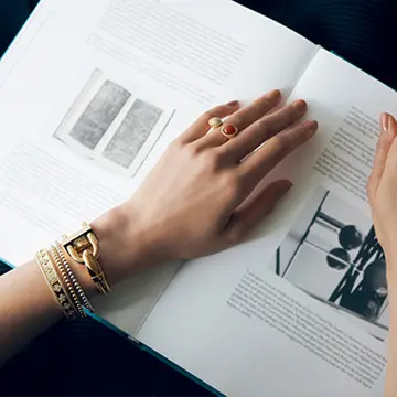 洋服が単調になりがちな夏は、カラフルなブレスレットでプレイフルな手もとに。ブルーの文字盤が印象的な「パテック フィリップ」の腕時計と、ダミアーニのブルーグラデーションブレスレットで、色をリンクさせたコーディネートを楽しみたい。