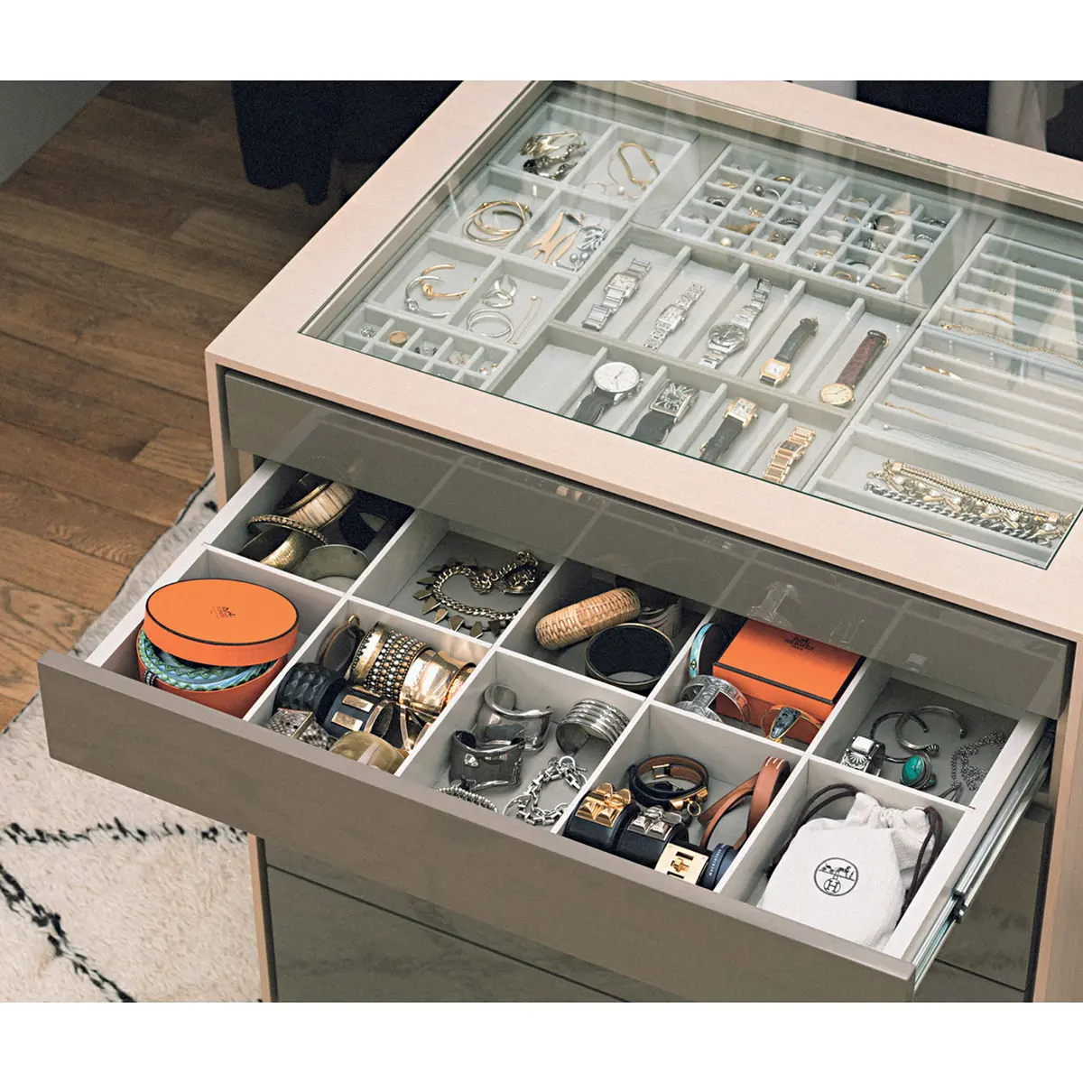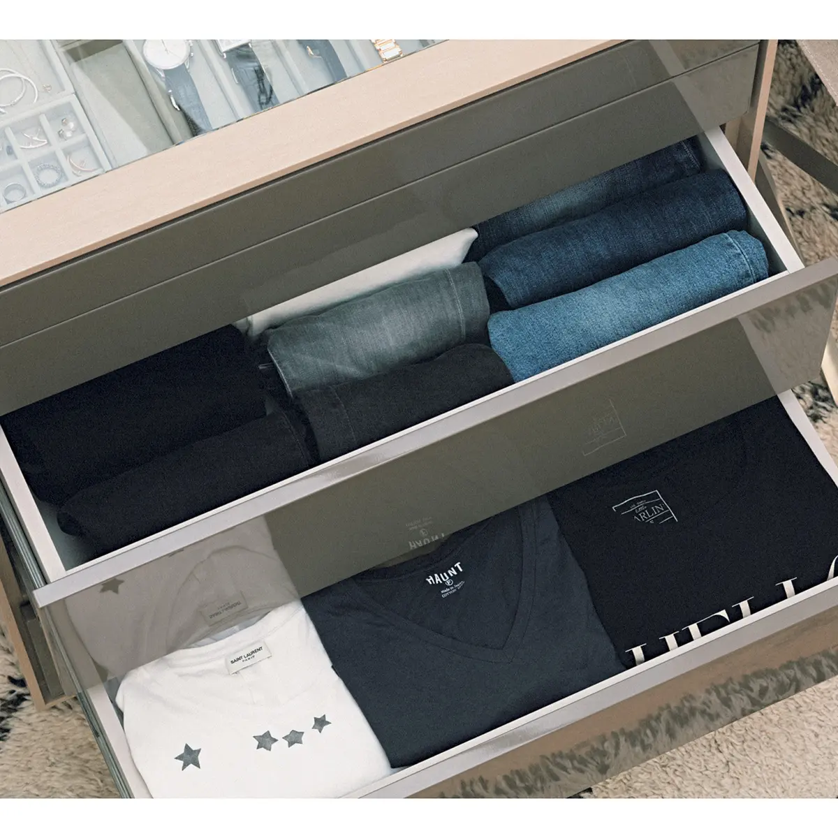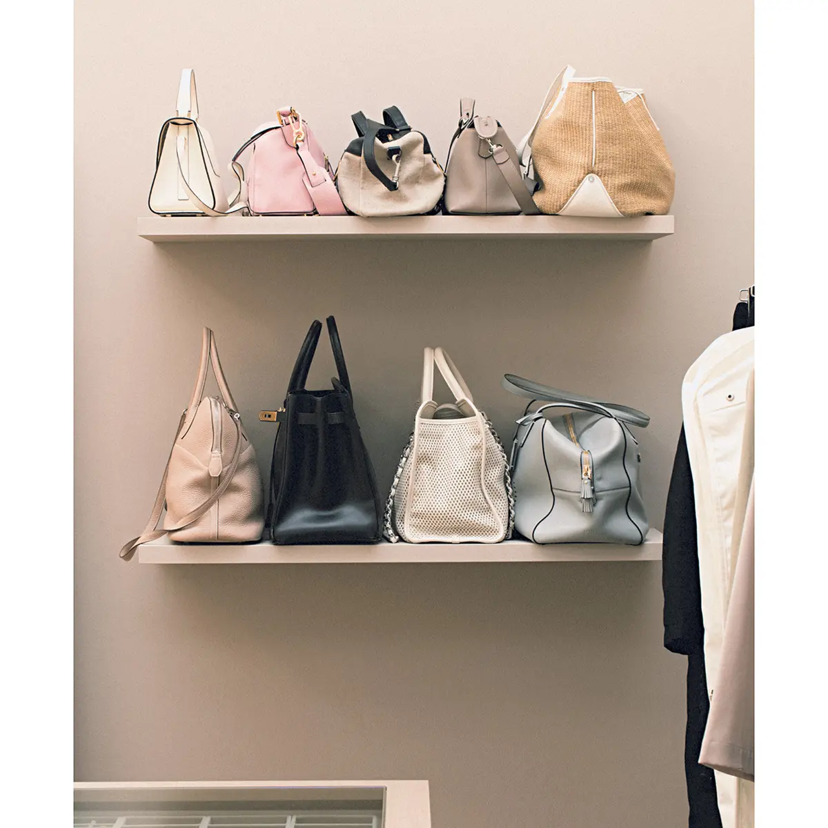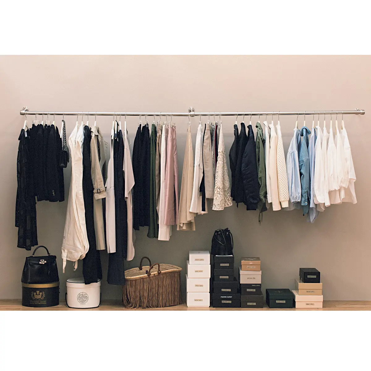 私服撮影のたびに、自宅から大量の服や小物を持ってきてくださる富岡さん。さぞかし準備や片づけが大変では?とスタッフが恐る恐る聞くと「あっという間ですよ」とにっこり。「クロゼットはキッチンと同じだと思うんです。よく使うお皿は取り出しやすい場所に、コーヒーカップや豆はまとめてコーヒーメーカーの近くに、と効率よく作業ができるよう収納場所を決めています。クロゼットも着る頻度やアイテムごとに仕分けをし、可視化して、使うものだけをすぐに出し入れできるように工夫」。服も小物も頭で把握できる量しか持たず、“余白のスペース”を大切にしているとも。「1シーズンに2回は見直し、手離すなどして余白をつくっておきます。そうすれば次に必要なものが見えてきて、新しいものも増やしやすい。服は仕事の道具であり、大好きなもの。だからこそクロゼットをいつもよい“氣”で満たしていたいんです」。毎回、大好評のコーディネートが生まれるのは、このクロゼットの動線のよさに秘密があった!