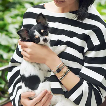 『プルミエール オリジナル エディション』[ゴールドプレート×レザー]腕時計¥759,000・『ココ クラッシュ』〈手首側から〉ブレスレット[YG]¥1,017,500・[BG]¥1,039,500・リング[YG]¥484,000/シャネル コート¥132,000/イザ(コート) 中に着たオールイワン¥34,000/レイ(ラウンジ レイ) 頭に巻いたスカーフ¥23,100/エストネーション(マナー マーケット)