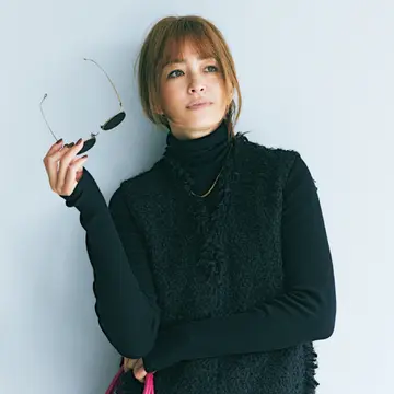 ベスト¥97,900/ドゥロワー 二子玉川店(ドゥロワー) ニット¥36,300/スローン パンツ¥45,100/サザビーリーグ(デミリー) サングラス¥60,500/アイヴァン 7285 トウキョウ(アイヴァン 7285) ネックレス¥25,300/八木通商(ローラ ロンバルディ) ストール¥23,100/ユナイテッドアローズ 六本木ヒルズ店(ユナイテッドアローズ) バッグ¥300,300・靴¥91,300/トッズ・ジャパン(トッズ)