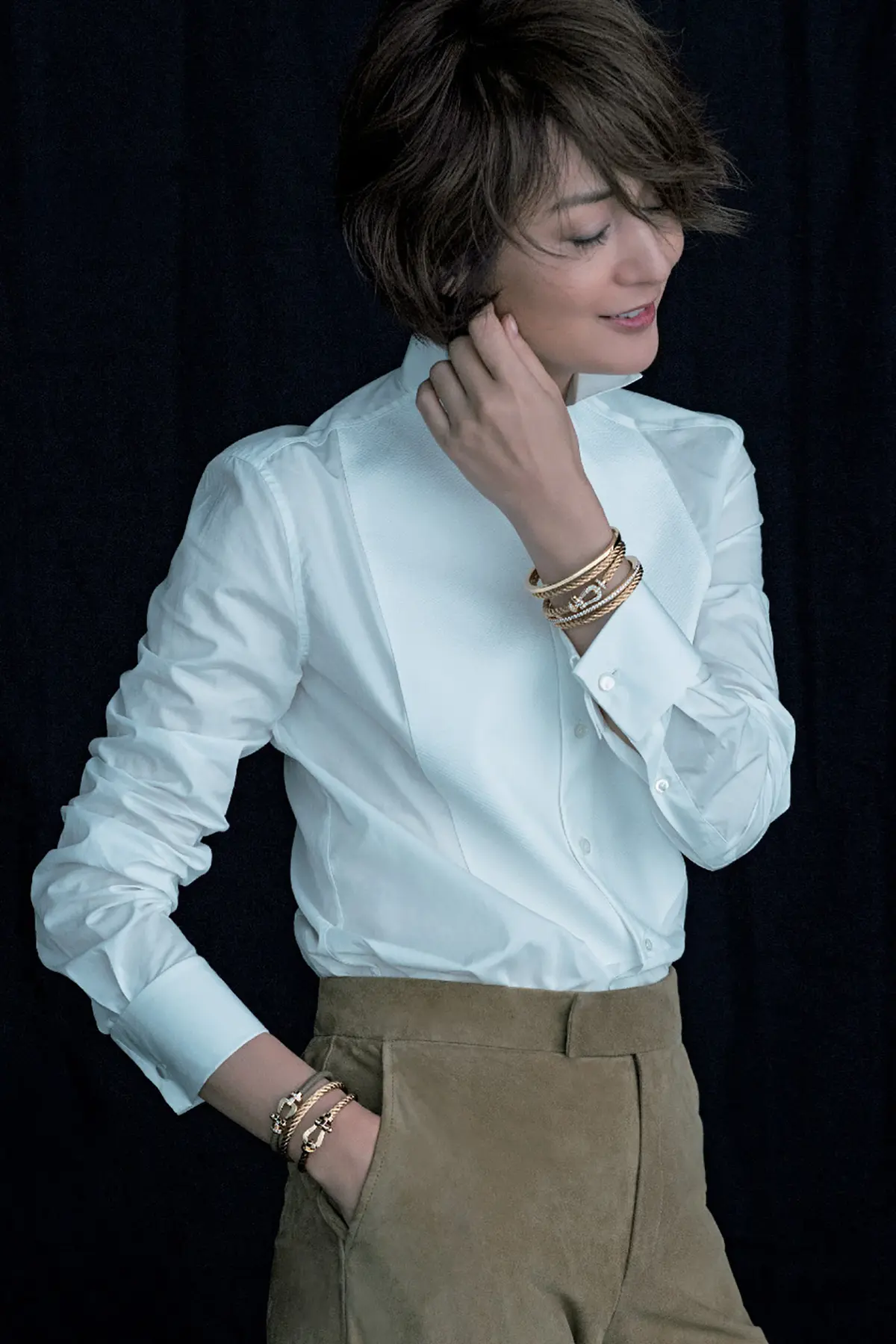 マニッシュさの中にひとさじの女性らしさを感じさせる白シャツはエクラ世代にとって永遠のパートナー。そんな白シャツに格をプラスしてくれるのは、あのブランドのゴールドジュエリー。
