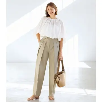 気になる肘が隠れつつ、ブラウジングすることでトレンドのニュアンスが表現できるギャザー袖。上品な光沢感としなやかな肌ざわりのスビンコットン素材で高見えするのも魅力! ほんのり立ち上がったモックネックが首まわりを美しく見せる。ジャケットのインに着ても襟もとがポイントに。(159cm Fサイズ着用)