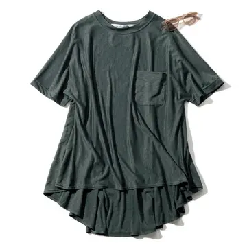 フロントからバックスリーブにかけて袖が一体化しているのが特徴。前から見るとシンプルなクルーネックTシャツ風で、着るとボリューミーなバックスタイルがきわだち、気になるヒップまわりもカバーしてくれる。涼感あるリネン混素材はイージーケアできるのも魅力。