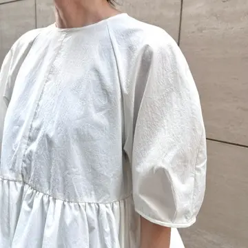 細かくギャザーが入りふんわり広がる裾に対して、ボックスプリーツで仕上げた袖がかっちりとした雰囲気で大人に丁度良い甘さに仕上がっています。