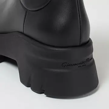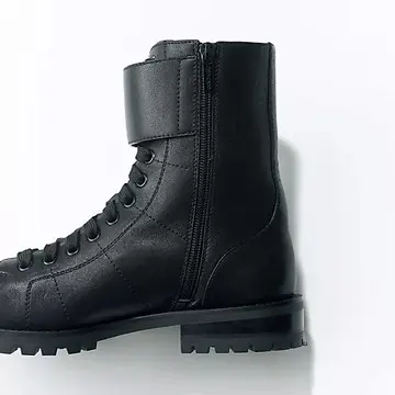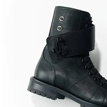 ブラックの柔らかなナッパレザーを使用したコンバットブーツ。内ジッパー開閉で履きやすいのがうれしい。足首をぐるりと囲むバンドには同色のJCのロゴが。ゴツすぎないラバーのトレッドソールで歩行も快適だ。
