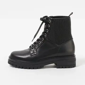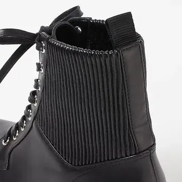 履き口にリブを施し、靴ひもをほどかずにそのままスポッと履けてしまう画期的なコンバットブーツ。優しい印象のラウンドトゥだからゴツいイメージになりすぎないのも人気の秘密。なめらかなカーフレザーを使用。