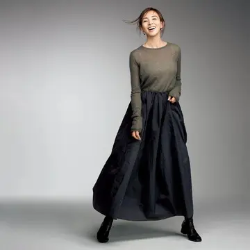 ほどよい透け感のシフォンプリーツとバックサテン素材、たっぷりとした袖がポイントになっており、オケージョンシーンにぴったり。シルエットはタイトながら、ウエストゴムで締めつけ感ゼロ。