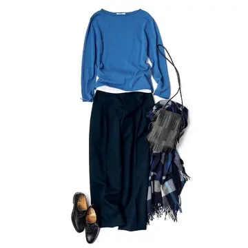 ニットは首につかず離れずの女性らしいボトルネックとボクシーなシルエット、コンパクトな丈感のバランスが印象的。ふっくらと暖かい糸を使用しており、驚くほど軽やかな着心地。
