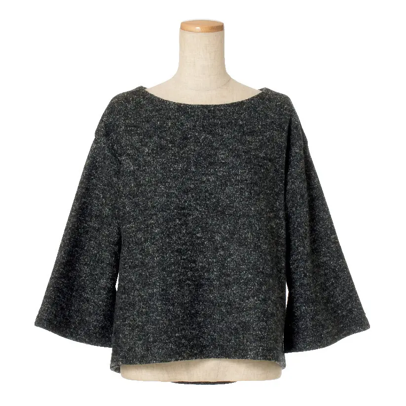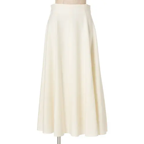 控えめにラメが輝くネイビーのプルオーバーに、オフホワイトのアシンメトリーなフレアスカートの、ほどよく高級感のあるコーディネート。いずれも上質素材ならではの心地いい肌ざわりだから、ストレスなくドレスアップできるのがうれしい。ボリューム感を計算しつくしたシルエットで、首まわりや手首、足首のほっそり見えも実現!