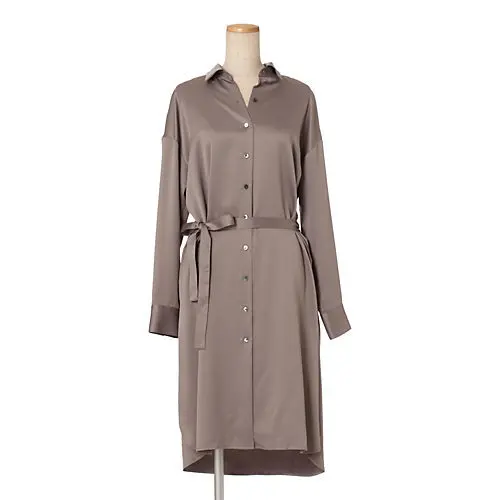光沢あるサテン素材のロングシャツを、共布ベルトでウエストマークしてシンプルなブラックパンツと。計算された襟のデザインだから上品な胸もとが決まり、理想のシャツシルエットが簡単に。インナーしだいで、ディナーやオンタイムにも着られ、秋冬に重宝する一着。