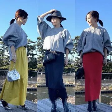 ニット部分は体のラインを拾わず、かつだらしなく見えないフィット感を吟味。張りのあるタフタ素材を使ったスカートはふんわりしつつ広がりすぎないのがポイント。短めニットをアウトにして着ているように見える。サイドスリット入りで横姿すっきり。