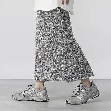 膨らみ感と光沢のある糸で分量感に対して軽く、ニットスカートにありがちな重たさはゼロ。涼やかなメッシュ素材で夏でも心地いいのがうれしい。体のラインを拾わないゆったりとしたドレープも魅力。腰部分にブランドロゴ入り。少し長めのミモレ丈なのでフラットシューズとも相性◎