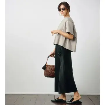 【スタイリスト 村山佳世子さんより】「短めTシャツが流行っていますが、大人がそのまま着ると短すぎたり小さめだったりと、むずかしいことが多いんですよね。とはいえ、短丈トップスは簡単にスタイルアップできる優れものなので取り入れない手はない! ということで、大人にほどよい丈感と身頃のゆとりにこだわった一枚を作っていただきました。裾のインアウトに迷うことなく、アウトがバランスよく決まる絶妙な着丈。おなかが見える心配はなし! さらにほんの少しだけ厚手の素材感で体のラインを拾わないのもポイント。これさえあれば、鮮度の高い夏の着こなしがすぐに完成するはずです。」