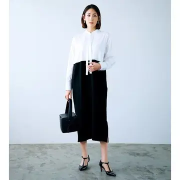 ニット¥29,700・スカート¥49,500/デパリエ 伊勢丹新宿店(デパリエ) ピアス¥37,400/リューク バングル¥46,200/フラッパーズ(シンパシーオブソウルスタイル) バッグ¥198,000/セルジオ ロッシ カスタマーサービス(セルジオ ロッシ)