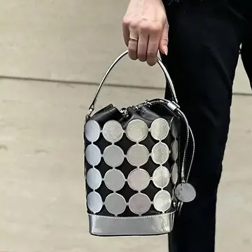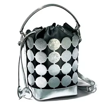 ”BULLES”は、シャンパンの泡をイメージしたシリーズ。ほどよい抜け感としゃれ感が同居するバケットバッグは、シルバーのレザーパーツとブラックのレザー内袋とのコントラストがスタイリッシュ。ストラップつきだから、コートでも肩かけ可能。高級感あるレザー内袋は巾着タイプだから、開け閉めが楽!