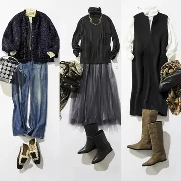 シンプルなタートルネックに、軽やかなグレーチュールスカートを合わせた上品お出かけスタイル。柔らかな着心地が心地良いトップスは動きやすい素材で、一日中快適な秋のお出かけをサポートします。ふんわりとエレガントに広がるチュールスカートを合わせれて華やかに。寒暖差対策にツイードジャケットを羽織ることで、シンプルなコーディネートに大人の洗練をプラス。足元はトレンドのレースアップブーツで、秋の街歩きに適した防寒性と歩きやすさを両立させて。アクセサリーにはシルバーのピアスとリングを取り入れて、控えめながらも女性らしい輝きを添えて。仕上げに落ち着いたカラーのリップを加えれば、程よく華やかな印象に。エレガントでアクティブな秋冬のお出かけコーデです。