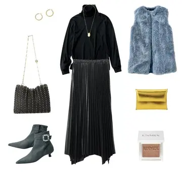 冬のおしゃれに映える、鮮やかなレッドのタートルニットを差し色にベロアのパンツとケープ型アウターでリラクシングな装いを。柔らかいベロア素材のワイドパンツは、落ち着いた大人の雰囲気。ホワイトのケープコートは軽やかなシルエットで、エレガントな印象。足元はブラックのローファーで引き締めつつ、リブソックスでこなれ感を。シルバーアクセサリーとバッグでモードなアクセントも忘れずに。