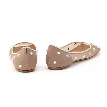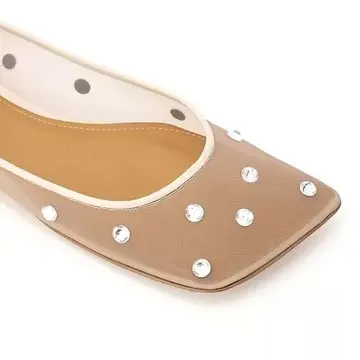 見た目にも軽やかな、今季注目のフラットシューズ。先端を大胆にカットしたスクエア型の爪先がユニークで、チュール素材ならではの美しい透け感も魅力的。ドット風に配された大粒ビジューも美しく、春夏の多彩なコーディネートに投入できます。