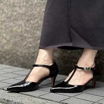ツヤ感のあるレザーがエレガントなストラップシューズ。素足で履くと、あしの甲をきれいに見せてくれるし、ストッキングや靴下をあわせると秋~冬まで楽しめます。5.5cmの安定感のあるヒールで美脚効果も抜群!