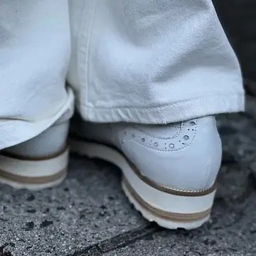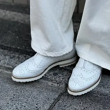 熟練した職人による、メダリオンと呼ばれるパンチングが施されたウイングチップデザイン。ホワイトのソールがさわやかで、足当たりがよく快適な履き心地。フェミニンなスカートに合わせるテイストミックスもおすすめ。見た目に反して非常に軽く、合成ゴムのソールはクッション性抜群。