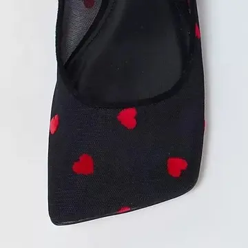ハートの刺繍が愛らしいフラットシューズ。ゴツくなりがちなスクエアトゥも、肌見えが絶妙な甲の浅さとトレンドのシアー素材を組み合わせることで、きれいめモードな一足に。斜めにカットされたスクエアトゥも遊び心があって、足元にインパクトが欲しい日に最適。足幅がある人も楽々履けてすっきり見えるところもうれしい。