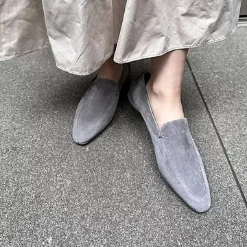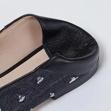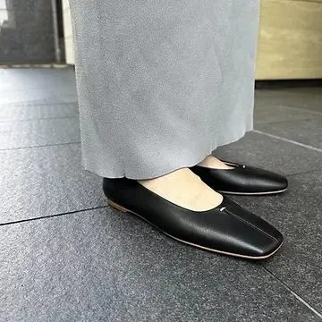 足に優しいスクエアトゥとフラットなヒールで、素足で履いても心地いいシューズ。ムダな装飾は省き、フロント部分のさりげないステッチと切り替えで上品なニュアンスに。万能ブラックは通勤にも。