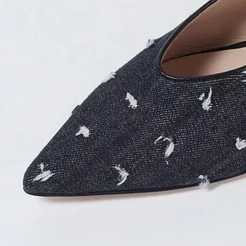 ぺたんこでも脚がきれいに見えると人気のフラットパンプスが、この春はコーデのアクセントになる旬のデニム地に。かかとを踏んでスリッパとしても使える2WAY仕様です。