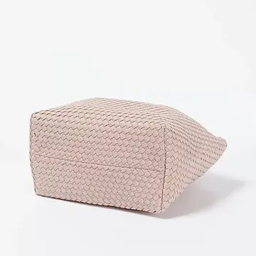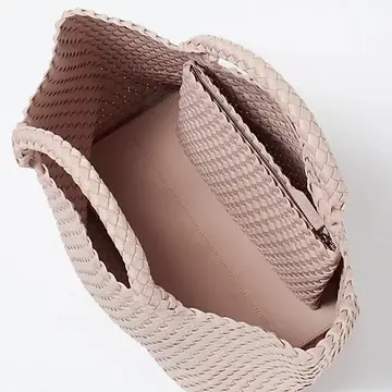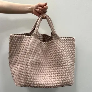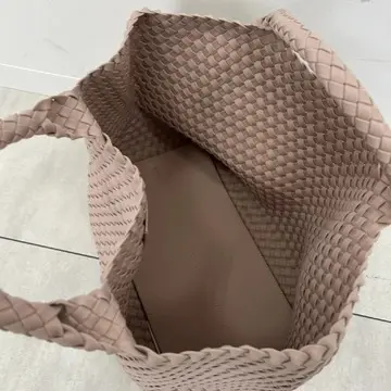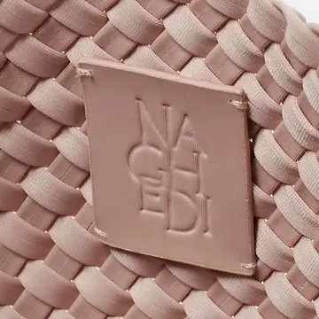 NAGHEDIのシグネチャートート。ポリエステル素材を巻いて織る独自の製法で作られた手織りバッグは、軽量で使い勝手抜群。ほんのりツヤのあるスモーキーなピンクがしゃれ感を高めて。