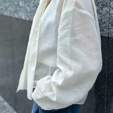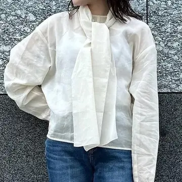 エレガントなシアー感が華やかな存在感を放つオーガンジーボウブラウス。マットな質感と上品なツヤが共存した、ナチュラルな風合いの素材を使用。ほどよくボリュームのあるボウタイが装いのアクセントに。ボウタイを取りはずすと、シンプルなインナーブラウスとして使えるのも魅力。裾をアウトしても着こなしやすい適度な丈感。