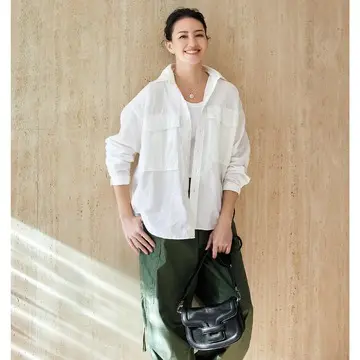 ミニマルなクルーネックトップスとフレアスカートのセットアップをエクラ世代の体を優しく包み込むシルエットにアップデート。軽やかなライトグレーは着回し力も大。