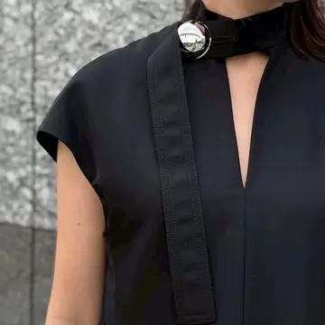 シンプルでありながらスパイスの効いたブラックドレスは、大人のお出かけやドレスアップに欠かせない存在。二の腕を適度に隠す上品な袖丈で、首もとのボタンがポイントになりアクセサリーいらずで着映える。
