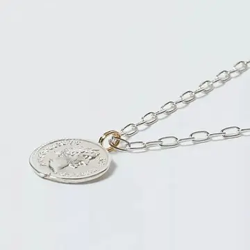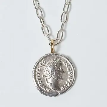 顔まわりにコインを配置することで存在感をアップ。華奢すぎないチェーンは、コインをはずして単体でつけてもポイントになる仕様に。高級感のある古代ローマ帝国の銀貨を象ったコインがポイント。コインには18金のバチカンを使用している。