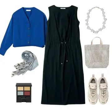 光沢感が美しいカーキのセットアップに、繊細なレースブルゾンを重ねて、大人の抜け感を演出。程よいリラックス感ときちんと感を両立し、50代の洗練された夏スタイルを叶えます。涼やかなブルー系スカーフは、首元やバッグに添えるだけで涼感と華やぎをプラス。ジュエリーやゴールドネイル、メタリックなかごバッグがリゾート感を漂わせ、週末のお出かけや旅先にもぴったりの着こなしに。