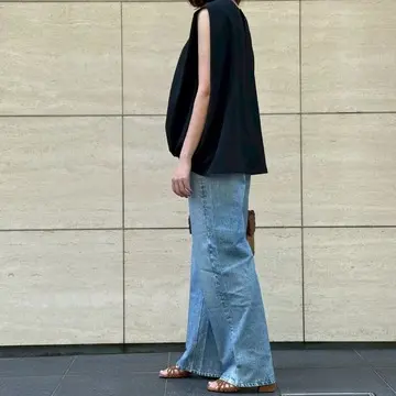 爽やかなサックスブルーには、ホワイトのトップスとあわせるときちんと感が。首元にスカーフを添えれば、さらに華見え。