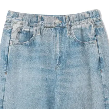 触らなければ気づかないほどの精巧なデニムプリントを施した、ジャージー素材のパンツ。ほどよいワイドで落ち感があり、ウエストゴム仕様。こんなにシルエットが美しいのにラクちんという意外性が大人気。部屋着のような着心地でおしゃれ見えが簡単にかなう! 自宅で洗濯できることも人気の理由。
