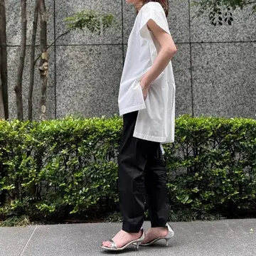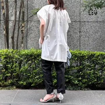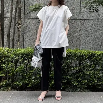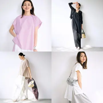 清涼感のある白のトップスは、すっきりとしたVスリットネックとフレンチスリーブで、顔まわりをシャープに見せながらも女性らしさを演出。さらりとした質感が肌に心地よく、真夏でも快適な着心地です。合わせたのは、陽だまりのようなイエローのワイドパンツ。ハリのある素材とセンタープレスが美脚効果を叶え、きれいめな印象に。かごバッグや白サンダルを合わせれば、リゾート感も漂う大人の夏スタイルが完成。