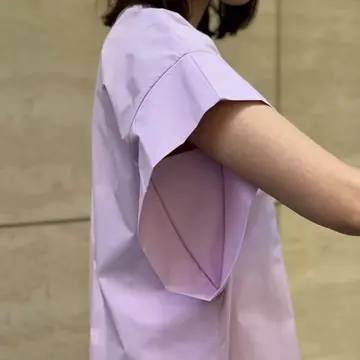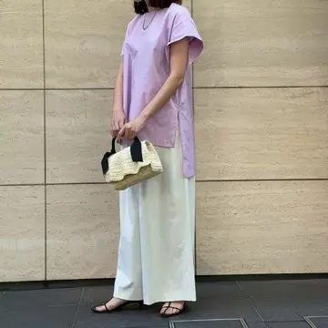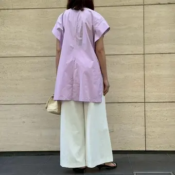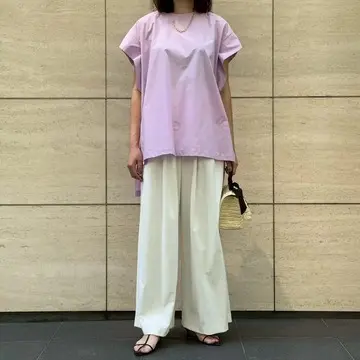 ふんわり広がるシルエットが魅力のラベンダー色のトップスは、長め丈とサイドスリットが体をすっきり見せてくれる優秀アイテム。光沢感のあるハリ素材が大人のカジュアルに上品さを添え、華やかなカラーながらも着こなしやすさ抜群です。ベージュのリネン風パンツを合わせれば、力の抜けたリラックス感と洗練が同居するコーデに。夏らしいかごバッグやフラットサンダルで、リゾート気分漂う大人の週末スタイルが完成します。