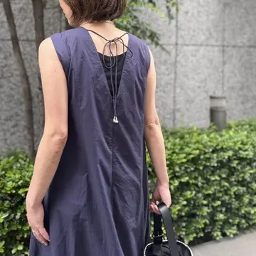 シンプルで上品なノースリーブドレス。裾のバルーンシルエットがアクセント♪女性らしい柔らかさと軽やかさが融合したデザインが魅力です!バックネックは深く切り込まれたVカットデザインで、大胆なワンポイントに。インナーをあえて見せて、レイヤードを楽しめます。