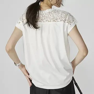 肩先をカバーするフレンチスリーブは、半袖Tシャツよりもぐっとフェミニンなムード。ほどよく光沢のあるスムース素材もきれいな印象に直結。首&袖口の始末は厚みが出ないよう繊細なつくりに。