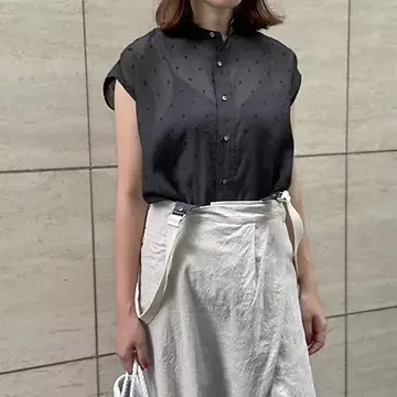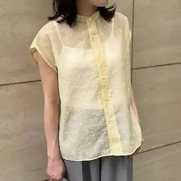 繊細なドットのエンブロイダリー(刺繍)が、シースルー素材の透明感と絶妙にマッチ♡透け感がいやらしくならず、上品に仕上がっています。肩のラインを美しく見せつつ、気になる二の腕もカバー。程よい抜け感で夏らしさを演出します。くすみ系イエローなので、派手にならず落ち着いた印象に。肌なじみもよく、大人の肌色をトーンアップ効果も嬉しいです!