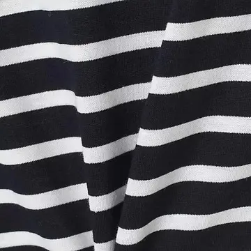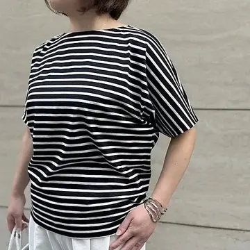 明るいネイビーだとカジュアルテイストが強くなってしまいますが、落ち着いたネイビーでぐっと大人っぽい雰囲気に。他のボーダーTシャツと一線を画すのが裾にかけて緩やかに細くなっていくデザイン。だらしなく広がる事もなく、ボディラインに寄り添ってくれるので、着やせ効果も発揮してくれます!